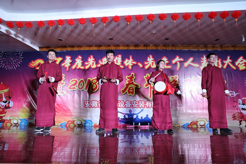 整場(chǎng)聯(lián)歡會(huì )由音歌快板、情景劇、小品、詩(shī)朗誦、舞蹈、才藝表演、女聲獨唱等12個(gè)節目組成,均為職工自編自導自演。伴隨著(zhù)悅耳動(dòng)聽(tīng)的音歌快板表演《企業(yè)興旺我自豪》,聯(lián)歡會(huì )正式拉開(kāi)序幕。情景劇《我驕傲 我是省安人》,反映了安徽安裝人用勤勞和汗水,創(chuàng )造了一個(gè)個(gè)值得驕傲的碩果;詩(shī)朗誦《風(fēng)雨同行 以心筑夢(mèng)》,展現了安徽安裝人不斷開(kāi)拓新市場(chǎng),實(shí)現新突破的壯麗征程;舞蹈《精忠報國》,傳遞了安徽安裝人激昂豪邁,強烈愛(ài)國主義的情懷;情景劇《擼起袖子加油干》,表達了安徽安裝人不忘初心,團結一致砥礪奮進(jìn)的決心;男生合唱《明天會(huì )更好》,抒發(fā)了全體安徽安裝兒女同心同德,共筑企業(yè)燦爛明天的美好心愿,歡快的音符,優(yōu)美的旋律,振奮的歌詞,贏(yíng)得了現場(chǎng)觀(guān)眾的歡呼喝彩與陣陣掌聲,將現場(chǎng)的氣氛推向高潮。演出過(guò)程中還穿插了抽獎和游戲環(huán)節。