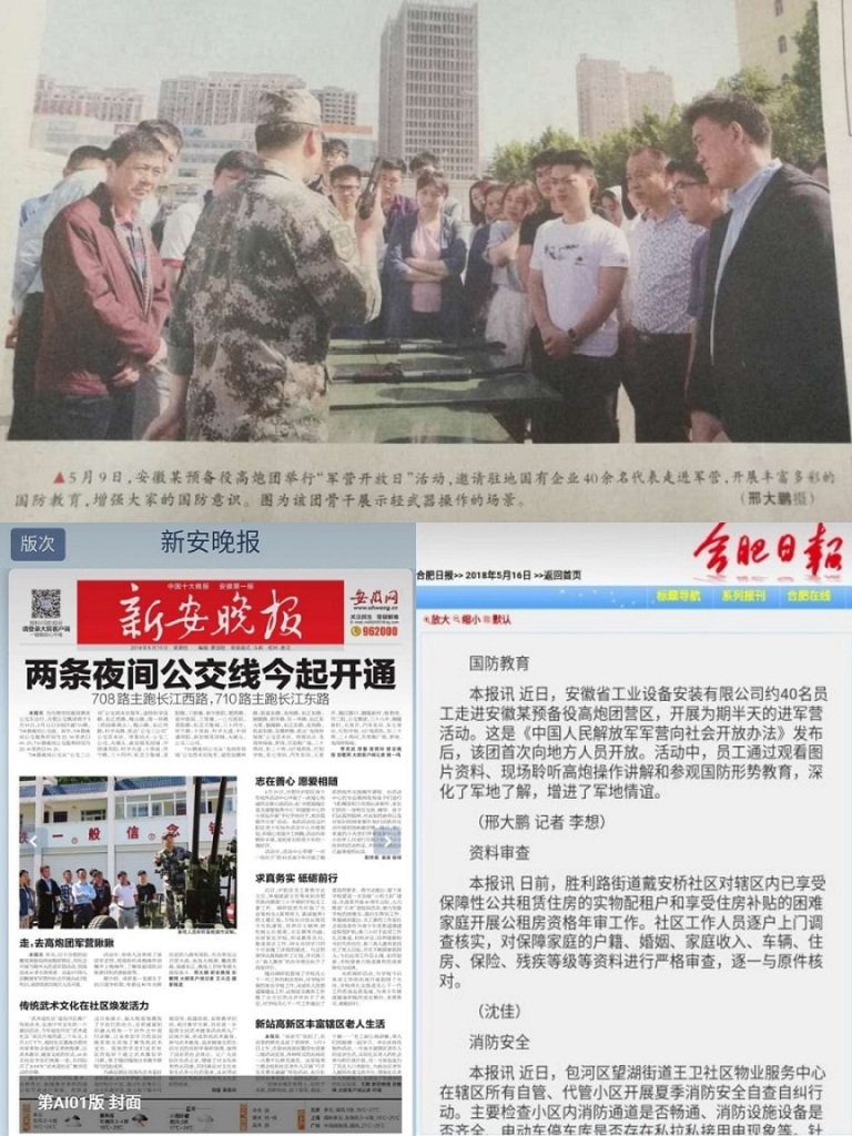 自5月9日安徽安裝公司組織開(kāi)展赴安徽預備役師高炮團營(yíng)區開(kāi)展“走進(jìn)軍營(yíng)·感受軍魂”愛(ài)國主義教育實(shí)踐活動(dòng)以來(lái),合肥日報、新安晚報、人民陸軍報等多家媒體對此活動(dòng)進(jìn)行了報道。