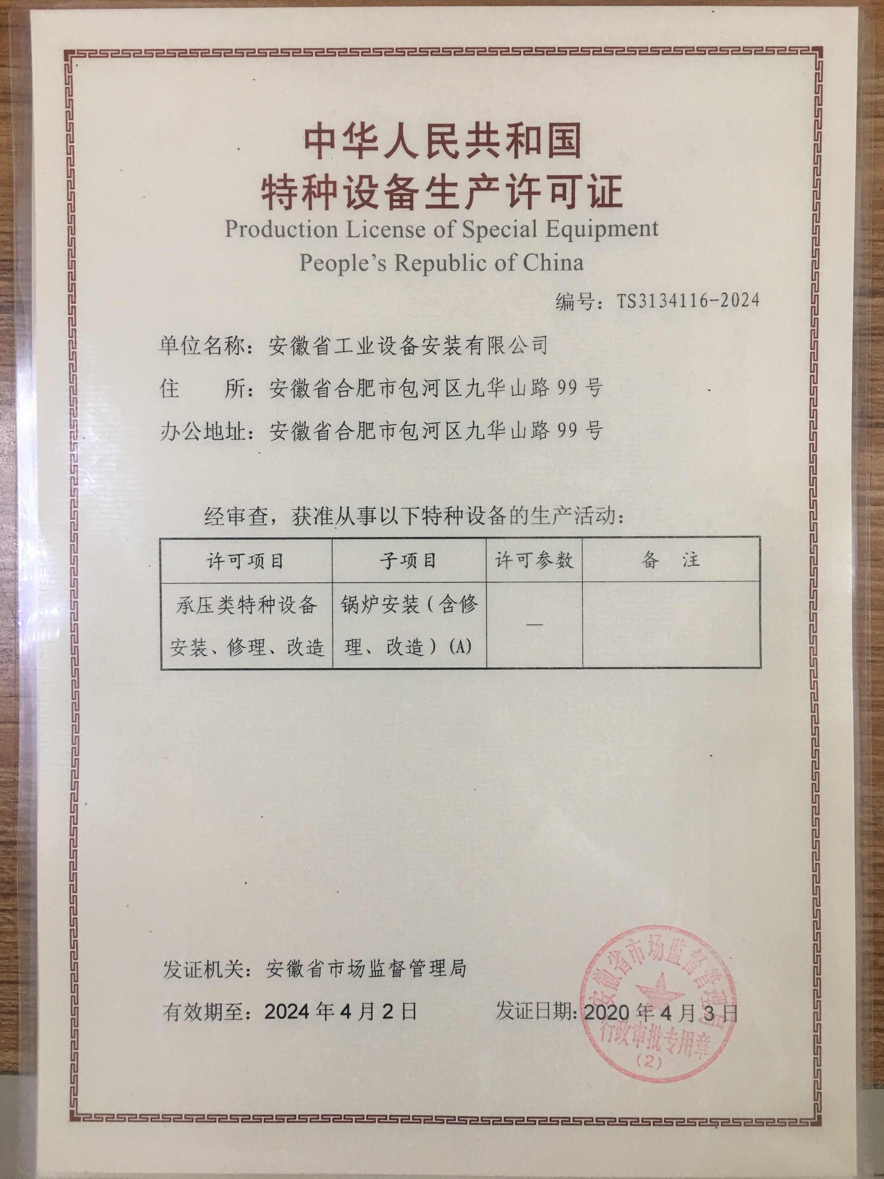 2020年4月3日,安徽安裝公司鍋爐(A級)安裝維修許可換證評審順利通過(guò),該證書(shū)由安徽省市場(chǎng)監督管理局發(fā)放。