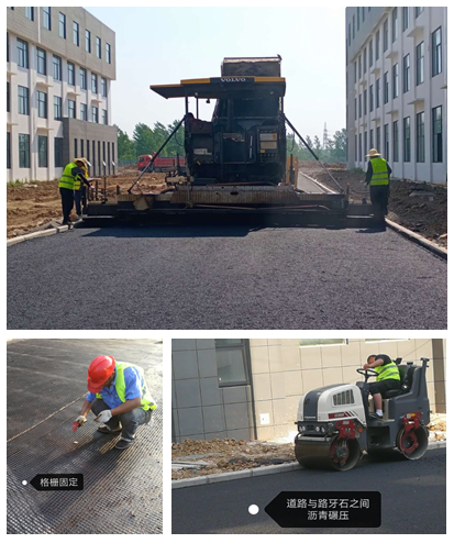 界首出口企業(yè)培育基地工程——瀝青混凝土面層攤鋪、格柵固定及路牙石邊瀝青碾壓