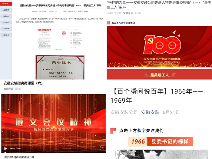 公司黨委第一時(shí)間編印專(zhuān)刊宣傳板報下發(fā)至所屬各單位和基層項目一線(xiàn),用好企業(yè)網(wǎng)站、微信公眾號、電子屏、宣傳欄和所屬各單位、各項目部所有宣傳陣地,在公司網(wǎng)站、微信公眾號先后開(kāi)設“百個(gè)瞬間說(shuō)百年”“黨史學(xué)習教育專(zhuān)欄系列報道”“榜樣的力量——安徽安裝公司先進(jìn)人物先進(jìn)事跡展播”“記錄奮進(jìn)力量—安徽安裝公司基層一線(xiàn)事跡展播”等專(zhuān)欄進(jìn)行專(zhuān)題宣傳,大力營(yíng)造“學(xué)習黨史有熱情,干事創(chuàng )業(yè)有激情”的良好氛圍,合肥分公司黨支部舉辦黨史學(xué)習教育主題攝影大賽,努力營(yíng)造悟初心、守初心、踐初心的強大聲勢。