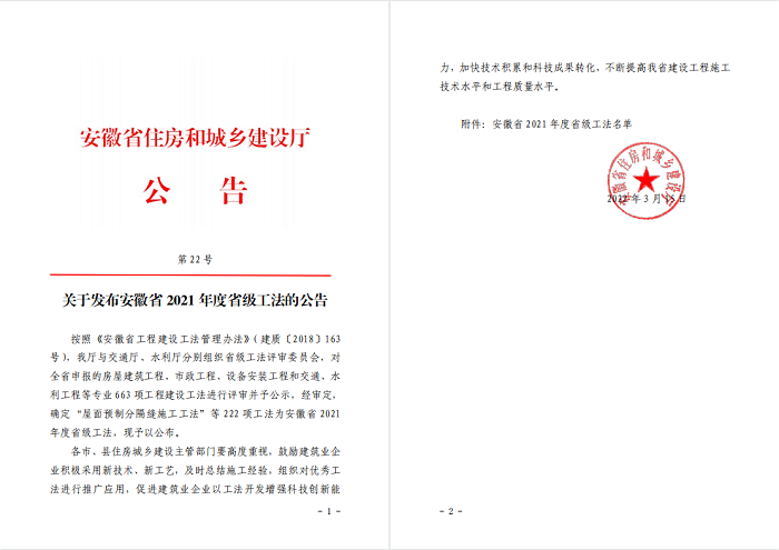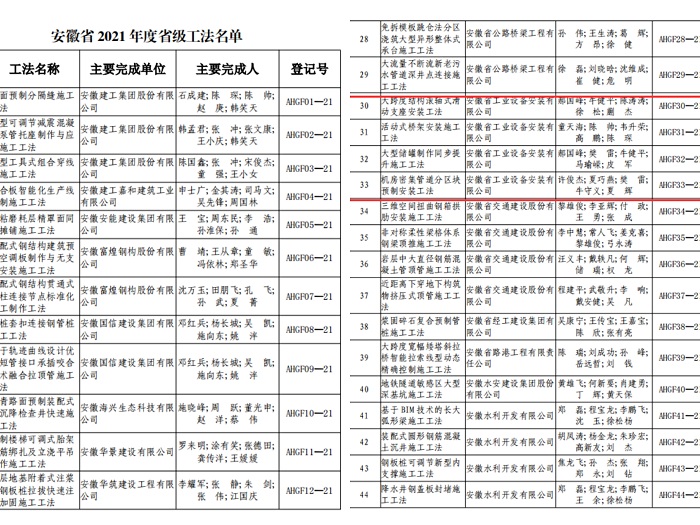 近日,安徽省住房和城鄉建設廳第22號公告公布2021年度安徽省省級工法名單,安徽省工業(yè)設備安裝有限公司的《大跨度結構滾軸式滑動(dòng)支座安裝工法》、《活動(dòng)式橋架安裝施工工法》、《大型儲罐制作同步提升施工工法》和《機房密集管道分區塊預制安裝工法》榜上有名。
