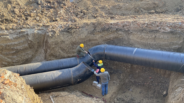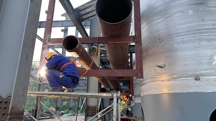 工藝管道班組也在忙忙碌碌,壓縮空氣管道在不斷架設,料場(chǎng)加工好的管道在吊車(chē)、葫蘆的牽引下就位,專(zhuān)業(yè)的焊工進(jìn)行焊接,慢工出細活,保證每一道焊口符合規范要求,室外的循環(huán)水管也在與老廠(chǎng)的接口緊張對接。
