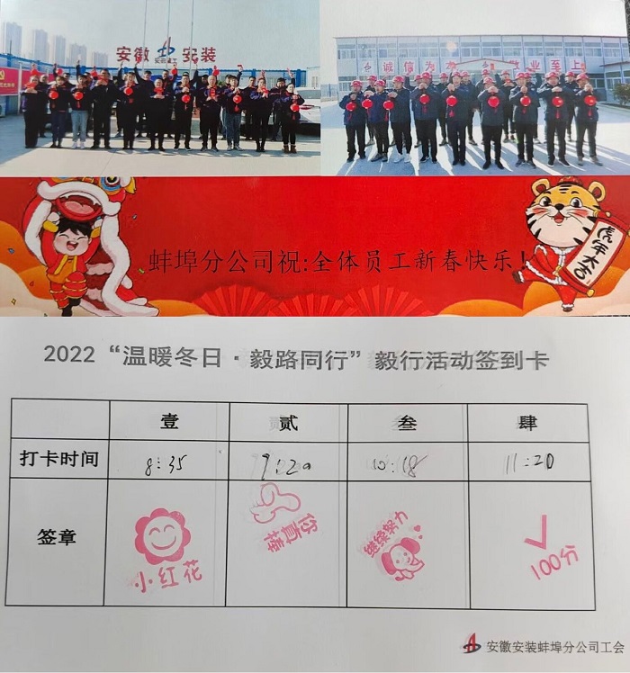 為展示安徽安裝蚌埠分公司員工積極向上的精神風(fēng)貌,倡導健康環(huán)保的生活理念,1月20日上午,分公司工會(huì )舉辦了一場(chǎng)主題為“溫暖冬日 毅路同行”的徒步毅行活動(dòng),分公司50余名員工參加活動(dòng)。