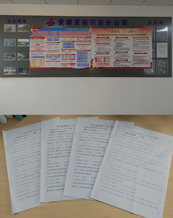 為抓好抓實(shí)黨的二十大精神的學(xué)習宣傳貫徹工作,近期,陜西分公司黨支部以“三會(huì )一課”、職工大會(huì )的形式組織開(kāi)展黨員干部職工學(xué)習黨的二十大精神學(xué)習研討會(huì );分公司開(kāi)展“學(xué)習宣貫黨的二十大”知識答題活動(dòng),以考促學(xué),以學(xué)促知,以知促用,充分檢驗學(xué)習效果;通過(guò)制作黨的二十大精神宣傳圖,開(kāi)展立體式廣泛宣傳,推動(dòng)大會(huì )精神深入職工群眾;通過(guò)開(kāi)展一系列特色學(xué)習教育與宣傳活動(dòng),切實(shí)把黨的二十大精神帶到職工群眾身邊,為提高黨員干部職工對黨的二十大精神的全面掌握與學(xué)習起到促進(jìn)作用,使黨的二十大精神成為分公司各項工作發(fā)展的思想與行動(dòng)綱領(lǐng)。