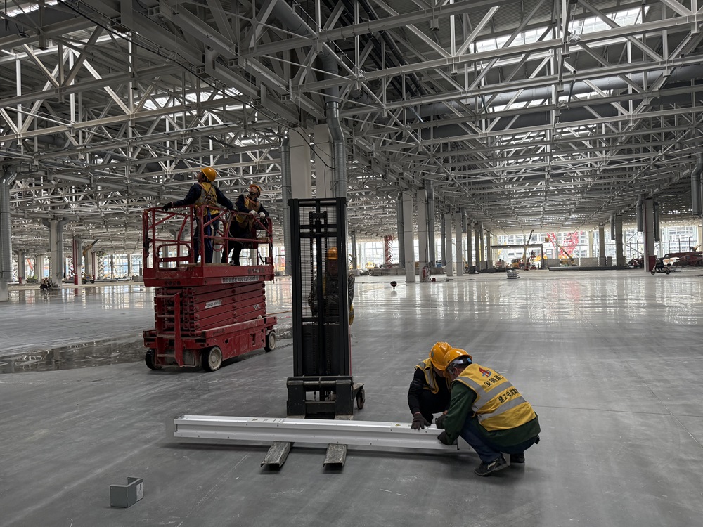 截至目前,焊裝車(chē)間燈具、車(chē)間一東側630毫米循環(huán)水不銹鋼管已全部安裝完成。本周完成消防箱安裝150套,母線(xiàn)安裝700米,屋頂風(fēng)機設備吊裝到位,如期完成節點(diǎn)目標。與此同時(shí),工藝廠(chǎng)家已進(jìn)場(chǎng)同步施工。