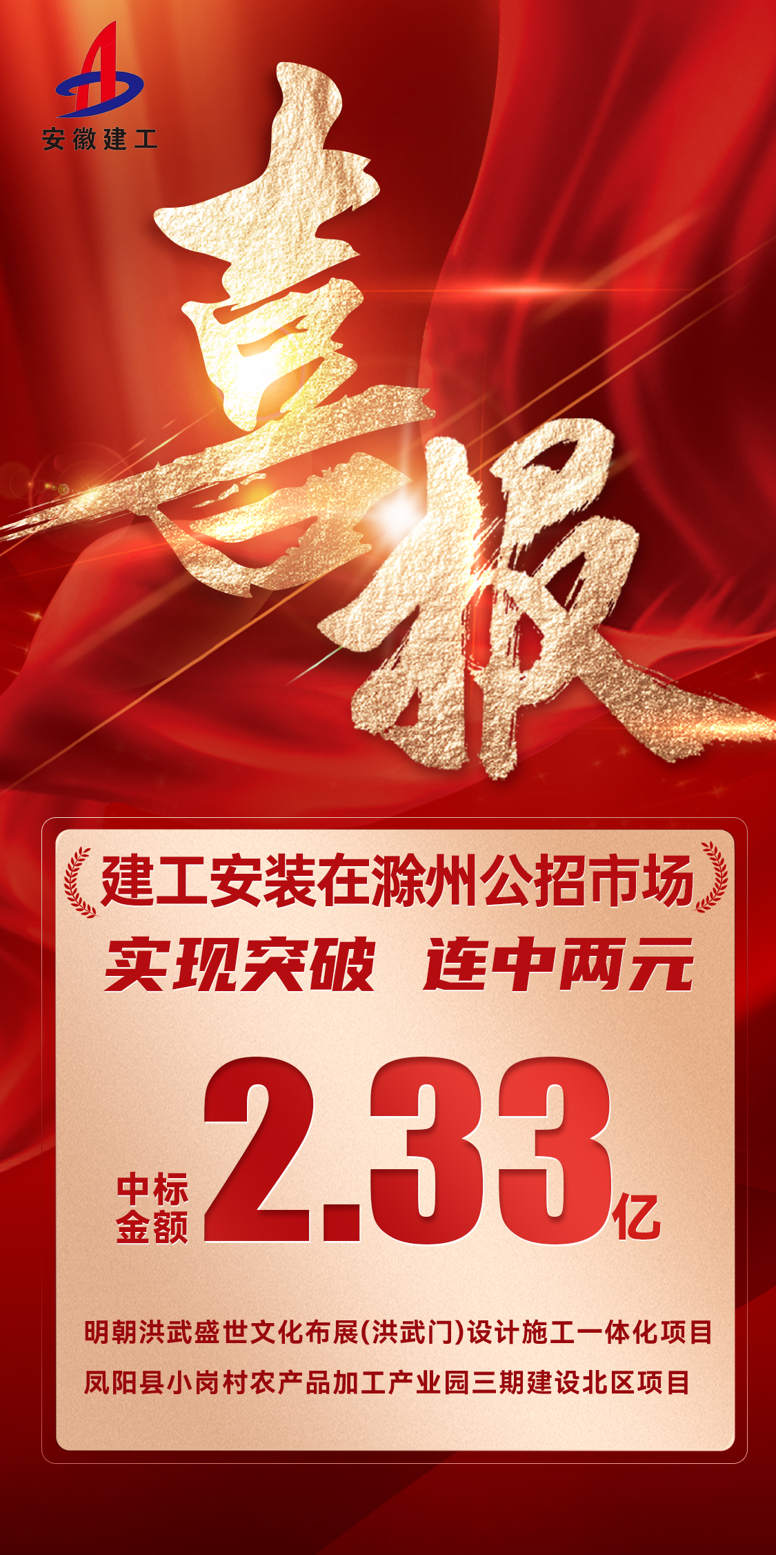近日,建工安裝連中兩標,成功攬獲明朝洪武盛世文化布展(洪武門(mén))設計施工一體化項目以及鳳陽(yáng)縣小崗村農產(chǎn)品加工產(chǎn)業(yè)園三期建設北區項目,中標金額2.33億元,在滁州屬地市場(chǎng)實(shí)現新突破。