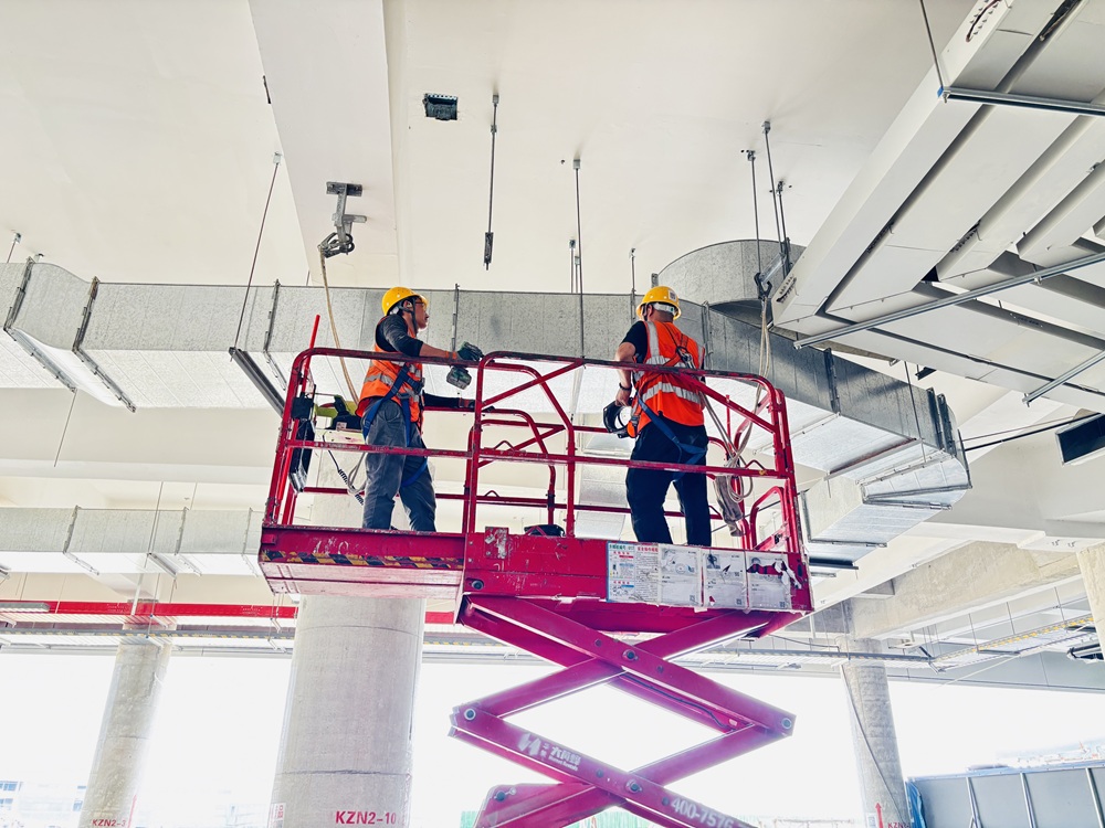 航站樓空間結構復雜,需多專(zhuān)業(yè)立體交叉作業(yè),項目部科學(xué)優(yōu)化施工組織,打出項目管理“組合拳”。全面推行周計劃進(jìn)度管控機制,將龐大建設任務(wù)分解細化為周目標,確保節點(diǎn)任務(wù)高效推進(jìn);深度運用BIM技術(shù)開(kāi)展碰撞檢查,實(shí)現風(fēng)管、水管、橋架等管線(xiàn)精準排布;關(guān)鍵區域實(shí)施24小時(shí)輪班作業(yè),人停機不停與時(shí)間賽跑。一系列舉措成效顯著(zhù),截至目前,機電主管線(xiàn)安裝已完成超過(guò)30%,南北指廊S2、S3區與N2、N3區的空調機房、熱力交換站設備已就位,機電主管線(xiàn)正全力推進(jìn)安裝,為后續設備安裝調試贏(yíng)得了寶貴時(shí)間。